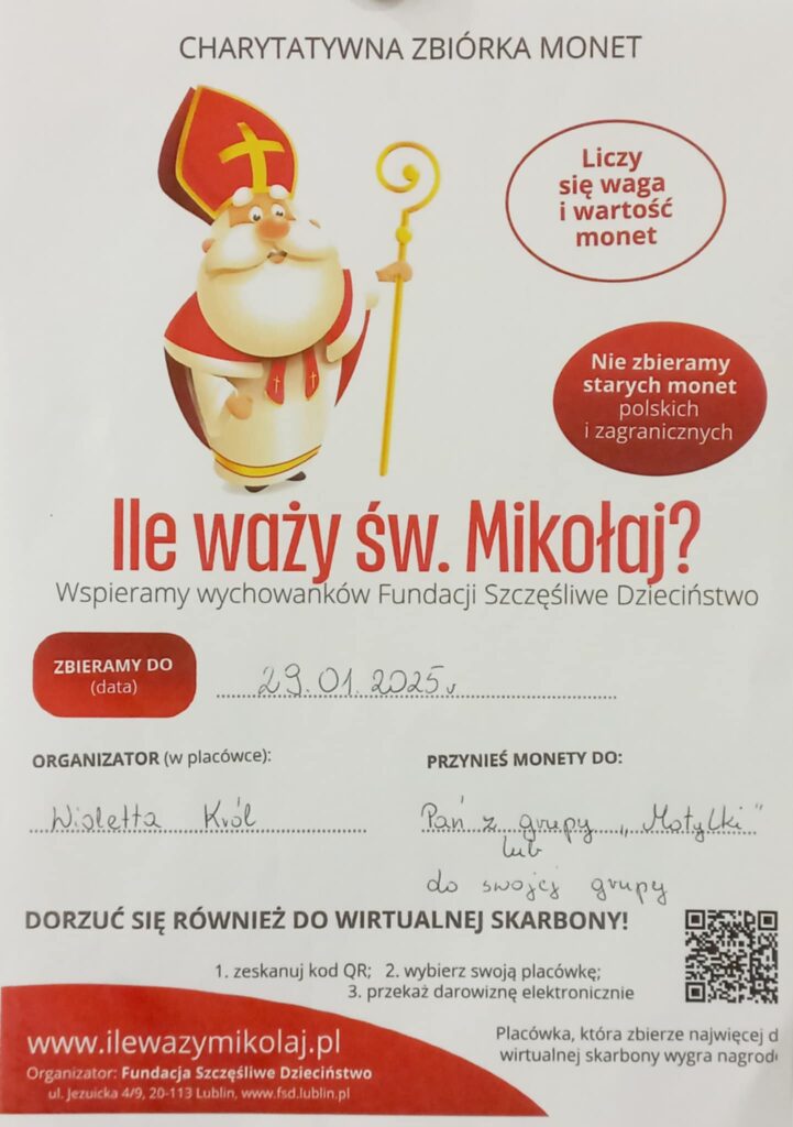 Nasze przedszkole przyłączyło się do Ogólnopolskiego Konkursu Charytatywnego „Ile waży Święty Mikołaj?”, który polega na zbieraniu bilonu (monety o różnej wartości od 1 grosza do 5 złotych) w okresie trwania konkursu. Bilon zbierany jest wśród dzieci, nauczycieli i pracowników naszego przedszkola. Pieniądze zebrane podczas trwania konkursu zostaną przekazane Fundacji Szczęśliwe Dzieciństwo.